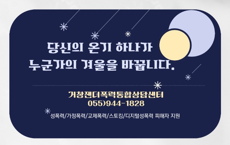 관련 문의는 거창젠더폭력통합상담센터(☎055-944-1828/1829)로 하면 된다.