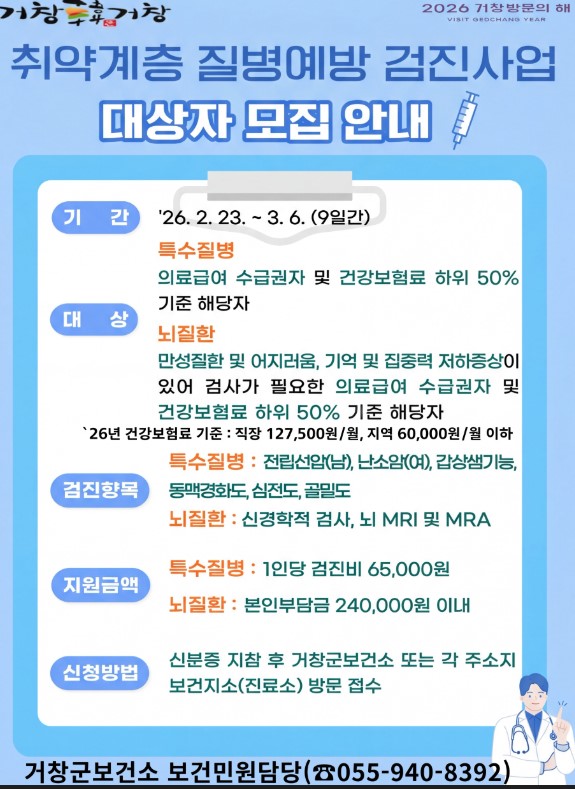 거창군은 의료 취약계층의 질병 조기 발견과 경제적 부담 완화를 위해 ‘2026년 취약계층 질병 예방 검진사업’ 대상자를 모집한다.