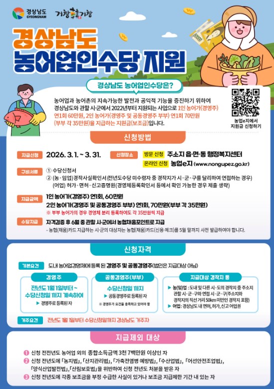 2025년 1월 1일부터 수당 신청일까지 경상남도에 계속해 주소를 두고, 같은 기간 농어업경영체에 등록한 농어가면 신청 가능하다.