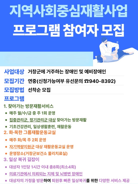 참여 대상은 거창군에 거주하는 법정 등록 장애인 및 및 예비 장애인(뇌병변, 지체 장애 등)과 재활이 필요한 만65세 이상 어르신이다.