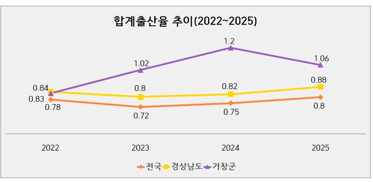 국가데이터처에서 25일 발표한 자료에 따르면, ‘25년 기준(잠정) 거창군의 합계출산율은 1.06명으로 전국 평균 0.80명, 경남 평균 0.88명을 훨씬 웃도는 높은 수치로 3년 연속 도내 합계출산율 1위를 기록하며 전국에서도 상위 50위 안에 드는 성과를 이루는 한편, 출생아수는 226명으로 5년 연속 도내 군부 1위를 기록하며 200명대를 유지하는 도내 유일한 군으로 자리매김하고 있다.
