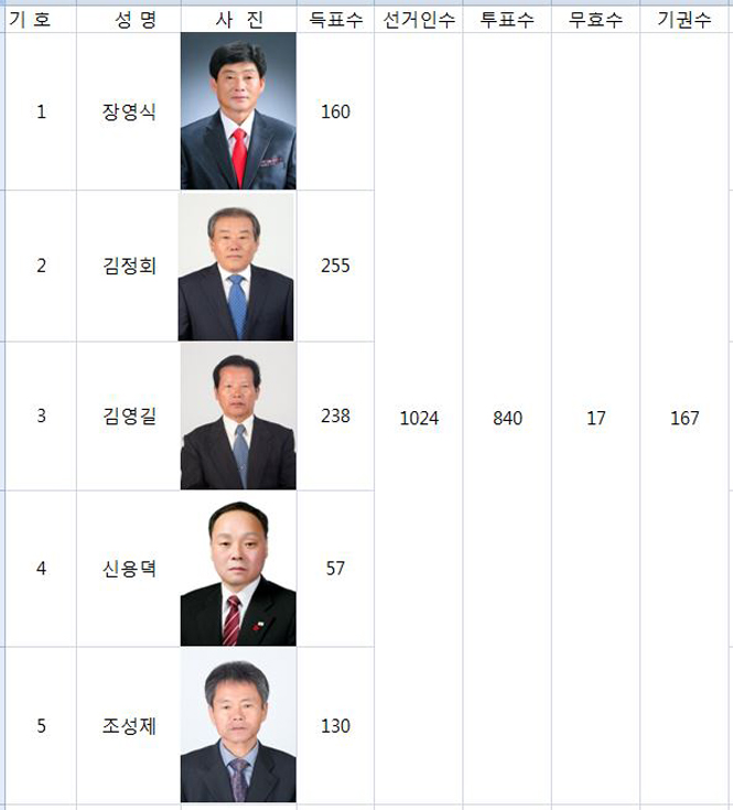 그외 기호 1번 장영식 후보는 160표, 기호 4번 신용덕 후보는 57표, 기호 5번 조성제 후보는 130표를 각각 얻었다.