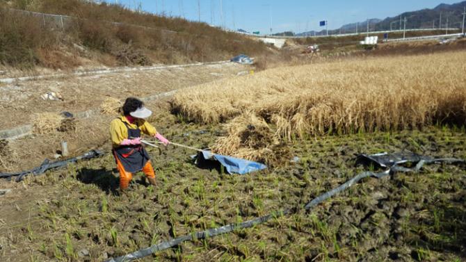 신 씨의 물논에는 올해 벼 수확을 포기하는 바람에 겨울에 접어든 지 오래지만 수확못한 벼가 넓은 논을 가득 채우고 있어 농심을 태우고 있다 .