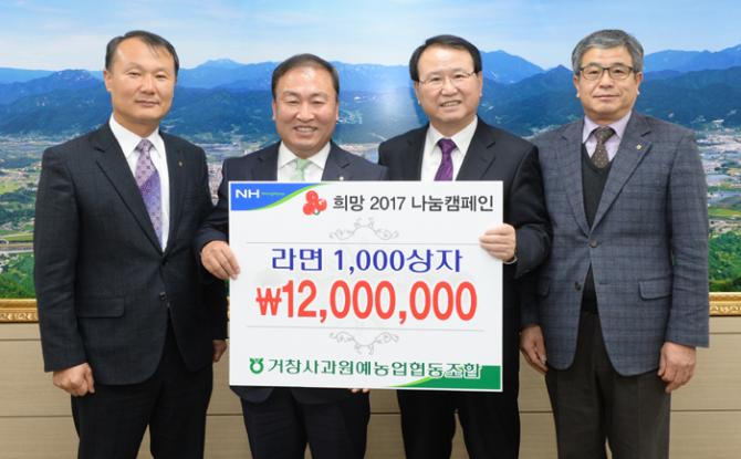 거창원예농협(조합장 윤수현)은 지난 22일 군청을 방문해, 관내 어려운 가정과 경로당에 지원할 라면 1,000상자(1,200만원 상당)를 ‘거창군 이웃돕기’에 기탁했다.