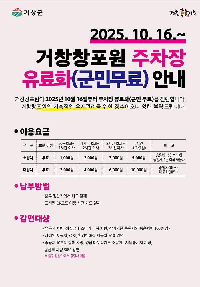 이번 조치는 「거창군 거창창포원 지방정원 관리 및 운영 조례」에 따른 것으로, 거창군민을 제외한 외부방문객 차량을 대상으로 주차요금을 징수할 계획이다.