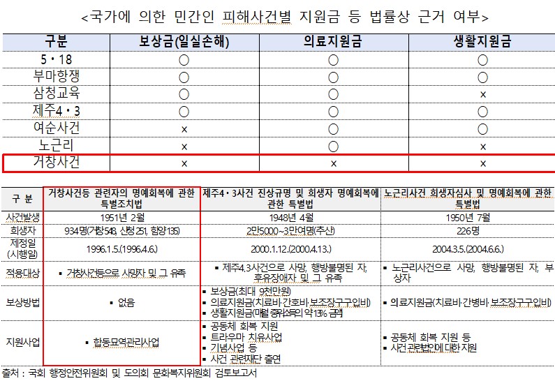 김 의원은 “유사한 민간인 피해사건의 경우 이미 보상, 의료·생활지원 등이 이뤄지고 있지만 거창사건은 위령제와 추모사업이 진행될 뿐 실질적인 회복에는 한 걸음도 나아가지 못하고 있다. 유족 대부분이 고령인 상황에서 더 이상의 지연은 회복의 기회를 박탈하는 결과”라며 “대부분 임기만료 폐기되고 어느 때는 정부가 재의 요구를 하는 바람에 정지된 배·보상 관련 입법이 이번에는 반드시 이뤄져야 한다”고 주장했다.