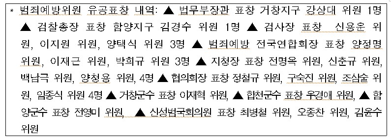 이어, 청소년 범죄예방위원으로서의 높은 사명감과 헌신적인 봉사활동 등으로 타의 모범이 되는 유공위원을 선정하여 법무부장관 표창* 등 다양한 표창장을 수여했다.
