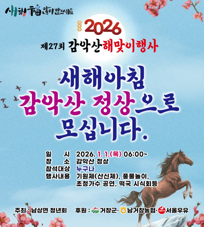 거창군은 병오년(丙午年) 새해를 맞아 군민의 안녕과 지역 발전을 기원하는 「제27회 감악산 해맞이 행사」를 2026년 1월 1일(목) 오전 6시부터 9시까지 감악산 정상에서 개최한다.