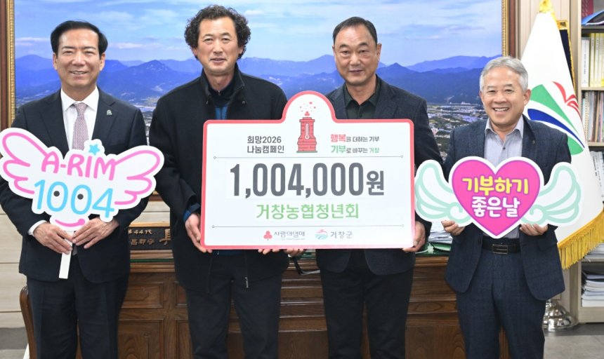 농업 경영 개선에 힘쓰는 거창농협청년회(회장 형남호)가 올해 처음 아림1004운동 대열에 합류하며 1,004천 원을 기탁했으며, 지난 25일에는 크리스마스트리문화축제위원회(대회장 정춘석)가 축제의 기쁨을 나누고자 1,004천 원의 성금을 기탁해 ‘사랑과 생명의 빛’이라는 축제의 취지를 몸소 실천했다.