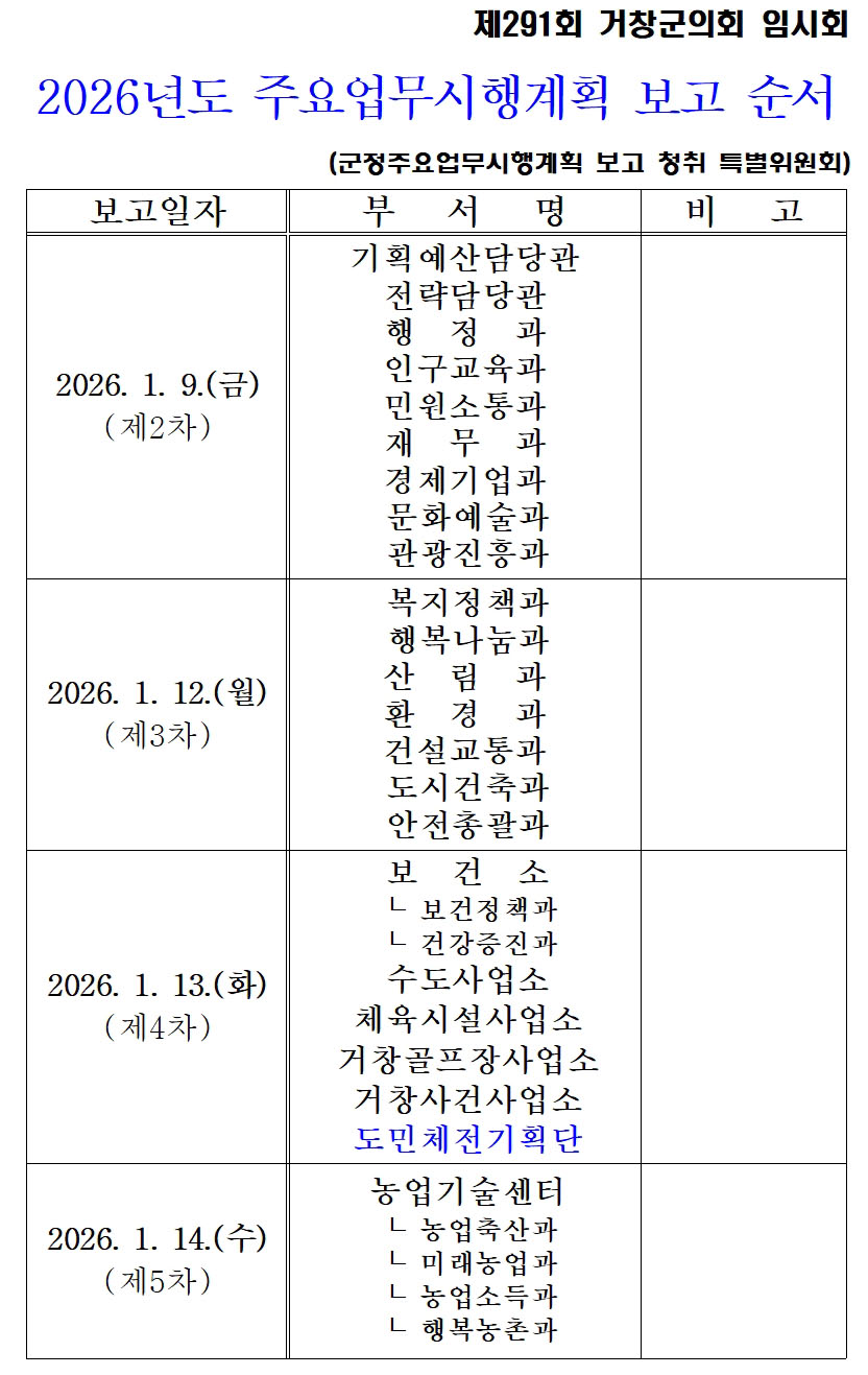 이번 임시회는 2026년도 군정 주요업무 시행계획 보고·청취를 중심으로 일반의안 및 기타 보고 청취건을 처리하며, 민선 8기와 제9대 거창군의회를 마무리하는 해의 출발점이라는 점에서 의미를 더하고 있다.