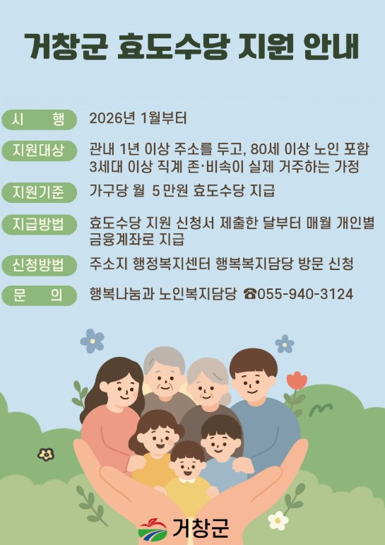 거창군은 경로효친의 건전한 가족제도 정착과 효 문화 확산을 위해 효도수당 지원 대상을 확대하고, 2026년 1월부터 본격 지급에 나선다.