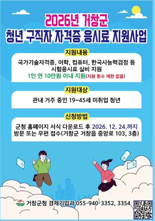 거창군은 미취업 청년의 취업 역량 강화와 경제적 부담 완화를 위해 각종 자격증 시험 응시료를 지원한다.
