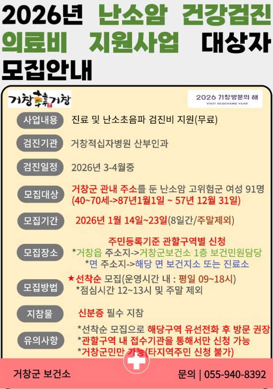 거창군은 여성암 사망률 1위로 꼽히는 난소암의 조기 발견과 치료율 제고를 위해 「2026년 난소암 건강검진 의료비 지원사업」을 실시하고, 오는 14일부터 23일까지 8일간 관내 주소를 둔 거창군민 중 고위험군 여성(40~70세)을 대상으로 희망자 91명을 선착순 모집한다.