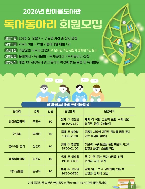 거창군 한마음도서관은 다음 달 2일부터 군민들이 함께 읽는 즐거움을 통해 독서 생활화를 실천할 수 있도록 ‘2026년 독서동아리’ 신규 회원을 모집한다.