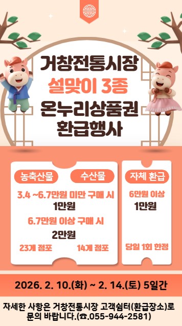 아울러, 거창전통시장은 명절 장보기 방문객 유입을 위해 ‘설맞이 온누리상품권 페이백’도 별도로 추진한다.