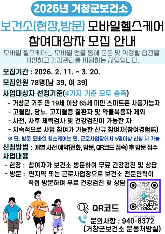 거창군은 3월 11일~3월 20일까지「2026년 보건소 모바일 헬스케어」사업 참여자 78명(남 39명, 여 39명)을 모집한다.