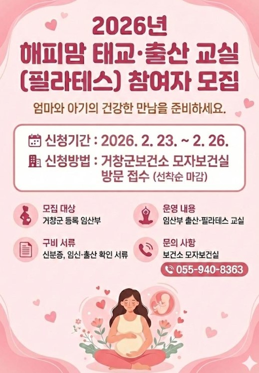 거창군은 건강한 임신기와 체계적인 산후 관리를 돕기 위해 2월 23일~26일까지 4일간 ‘해피맘 태교·출산 필라테스 교실’ 수강생 24명을 선착순으로 모집한다.