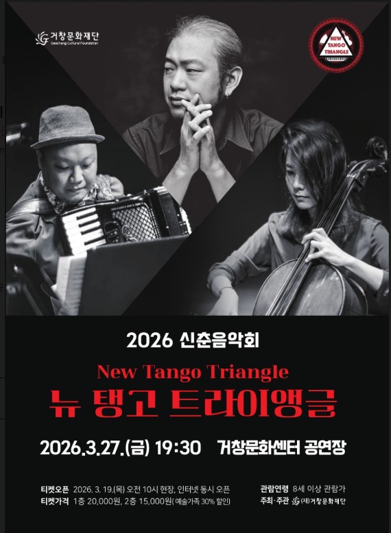 (재)거창문화재단(이사장 구인모 거창군수)은 3월 27일 오후 7시 30분, 거창문화센터 공연장에서 봄을 맞이하는 신춘음악회 ‘뉴 탱고 트라이앵글(New Tango Triangle)’을 개최한다.