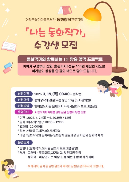 거창군은 한마음도서관에서 3월 19일부터 성인을 대상으로 창작의 기쁨을 선사하는 글쓰기 교육 프로그램 ‘나는 동화작가’ 참가자를 모집한다고 밝혔다.