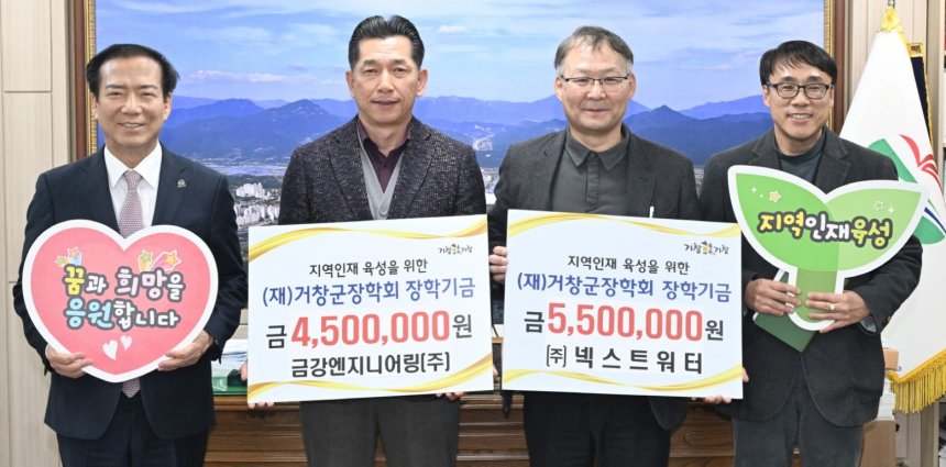 거창하수처리장 관리대행 업체인 ㈜넥스트워터(대표 김인석)와 금강엔지니어링㈜(대표 정선용)은 각각 550만 원과 450만 원을 거창군장학회에 기탁하며, 운영 수입의 일부를 지역사회에 환원하고 지역인재 양성에 보탬이 되는 뜻깊은 나눔을 실천했다.