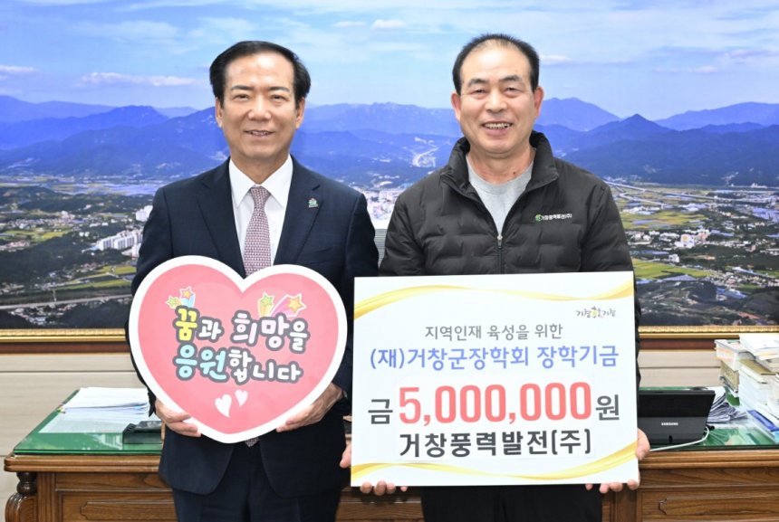 2018년부터 매년 장학금을 기탁하며 지역 사회공헌 활동을 꾸준히 이어오고 있는 거창풍력발전㈜은 올해도 500만 원을 기탁했으며, 기탁식에 참석한 임철호 소장은 “학생들이 지역의 따뜻한 관심과 지원 속에서 학업에 전념해 지역사회 발전에 기여하는 인재로 성장하길 바란다”고 말했다.