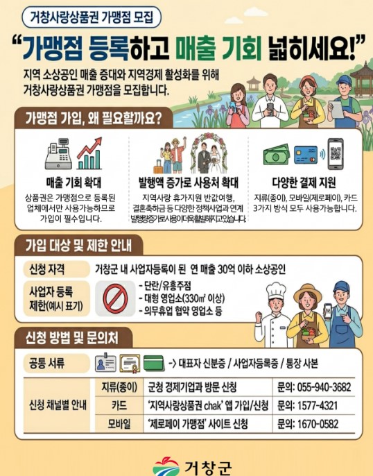 가맹 대상은 거창군에 사업자등록을 하고 영업 중인 연 매출 30억 원 이하 소상공인이며, 등록 시 신규 고객 유입과 매출 향상 효과를 기대할 수 있다.