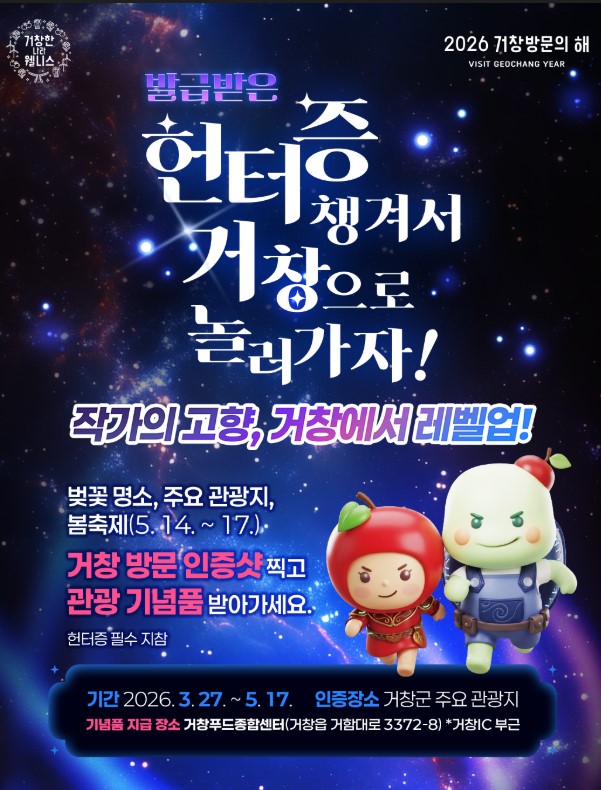 한편, ‘2026 거창방문의 해’ 관련 이벤트와 관광정보는 거창군 문화관광 누리집(https://www.geochang.go.kr/tour.web)과 공식 SNS를 통해 확인할 수 있다.