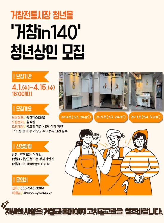 거창군은 오는 4월 1일부터 15일까지 전통시장에 활력을 불어넣고 청년 창업 기반 조성을 위해 거창전통시장 내 청년몰 ‘거창in140’에 입점할 청년 창업인 3명을 추가 모집한다.