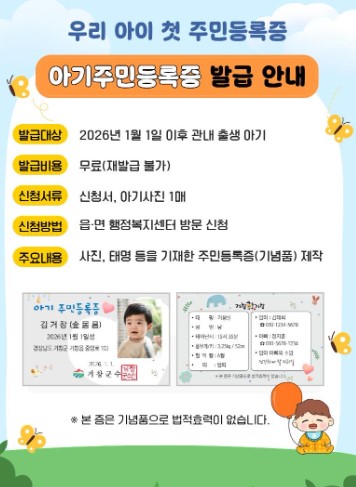 거창군은 소중한 아기의 출생을 기념하고 출산 장려를 위한 사회적 분위기를 조성하기 위해, 지난 2025년부터 시행 중인 ‘아기 주민등록증’ 무료 발급 서비스를 올해도 지속 추진하고 있다.