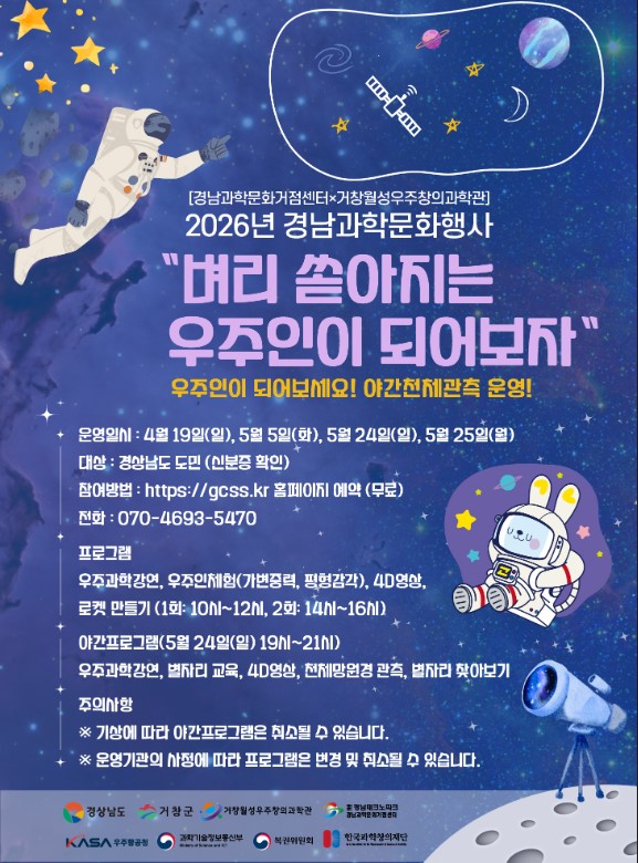 거창월성우주창의과학관은 4월과 5월, 우주를 주제로 한 2026년 경남과학문화행사 “벼리 쏟아지는 우주인이 되어보자”을 운영한다고 밝혔다.