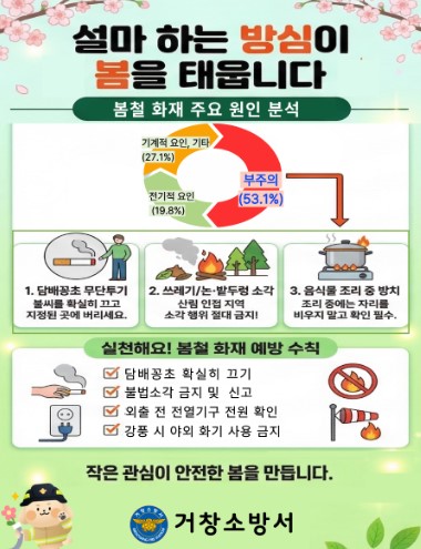 거창소방서(서장 강호봉)는 봄철 화재예방대책의 일환으로 화재 주요 원인을 ‘부주의’로 꼽고, 군민들을 대상으로 화재 예방 홍보에 나선다고 7일 밝혔다.