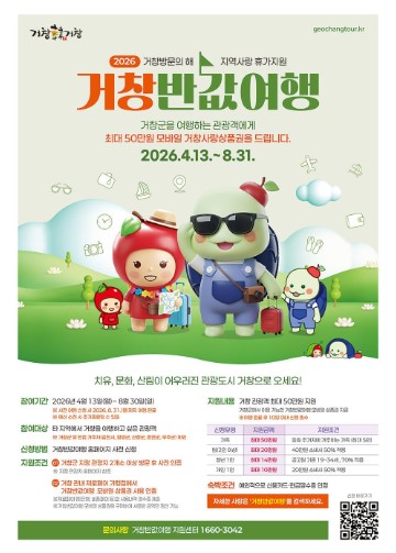 한편, ‘거창반값여행’ 2차 사전신청은 오는 2026년 5월 11일부터 진행될 예정이며, 여행기간은 5월 14일부터 6월 13일까지로 다시 한번 청정 관광도시 거창에 방문하길 원하는 관광객들의 많은 관심과 참여가 이어질 것으로 기대된다.