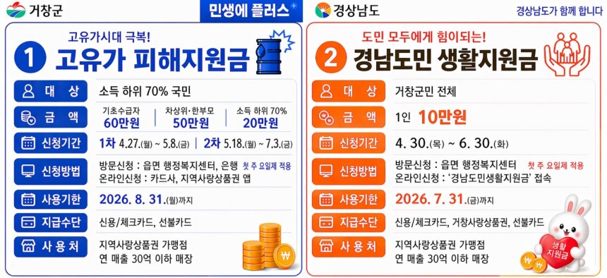 거창군은 장기화되고 있는 고유가와 경제침체에 어려움을 겪는 군민들의 생활안정을 위해 ‘고유가 피해지원금’과 ‘경남도민 생활지원금’을 지급한다.