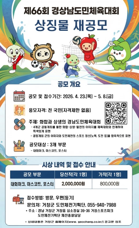 한편, 공동개최 4개군은 이번 상징물 공모를 통해 경남도민체육대회의 관심도를 높이고, 지역 간 화합과 축제 분위기를 조성해 나간다는 방침이다.