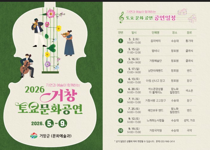 거창군이 주요 관광지를 무대로 군민과 관광객이 함께 즐길 수 있는 ‘2026 토요문화공연’을 본격 운영한다.