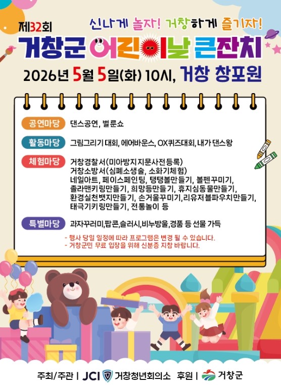 이번 행사는 거창청년회의소가 주관하며, 오전 10시부터 오후 3시까지 다채롭고 풍성한 프로그램으로 어린이와 가족 모두에게 특별한 하루를 선사할 예정이다.